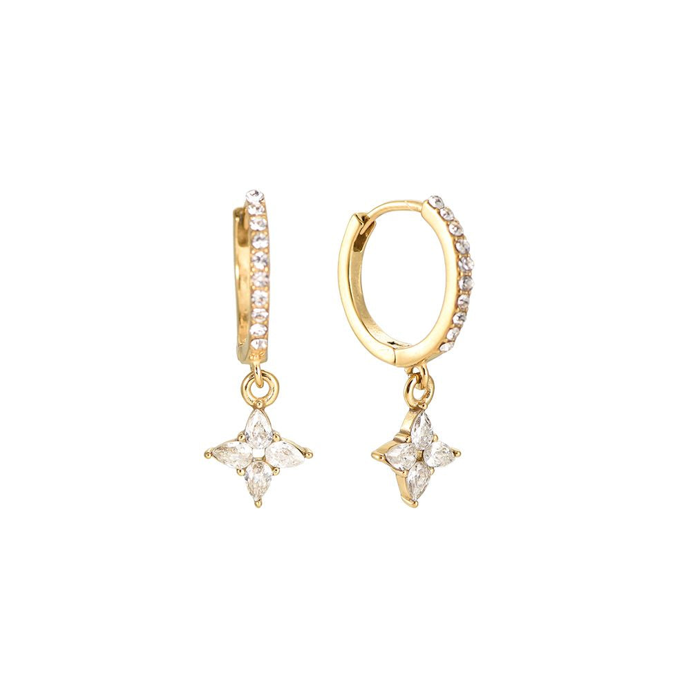 De Juna oorbellen zijn een echte eyecatcher voor wie houdt van verfijnde details en een sprankelende uitstraling. Deze elegante goudkleurige ringetjes hebben een handige kliksluiting en zijn versierd met kleine diamantjes, zowel in het ringetje zelf als in het stervormige hangertje.